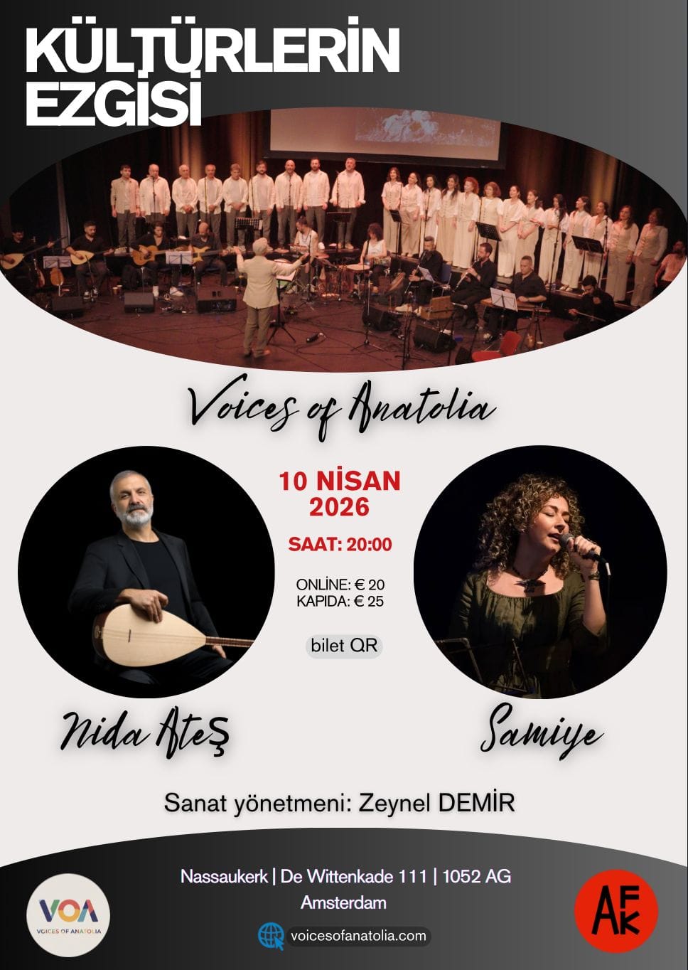 Voices of Anatolia (Anadolu Dilleri Korosu), Anadolu’nun çok kültürlü müzik geleneğini Amsterdam’ın kalbinde dinleyiciyle buluşturuyor. Farklı kökenlerden gelen koro üyeleri, ortak ezgiler etrafında birleşerek Anadolu’nun kültürel belleğini yeniden canlandırıyor.
